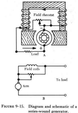 A compound wound generator combines a series winding and a shunt winding in such a way that the characteristics of each are used to advantage. The series field coils are made of a relatively small number of turns of large copper conductor, either circular or rectangular in cross section, and are connected in series with the armature circuit. These coils are mounted on the same poles on which the shunt field coils are mounted and, therefore, contribute a magnetomotive force which influences the main field flux of the generator. a diagrammatic and a schematic illustration of a compound wound generator is shown in A and B of figure 9-17.