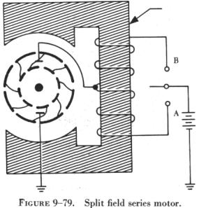 | One method for reversing direction of rotation employs two field windings wound in opposite directions on the same pole. This type of motor is called a split field motor. Figure 9-79 shows a series motor with a split field winding. The single pole, double throw switch makes it possible to direct current through either of the two windings. When the switch is placed in the lower position, current flows through the lower field winding, creating a north pole at the lower field winding and at the lower pole piece, and a south pole at the upper pole piece. When the switch is placed in the upper position, current flows through the upper field winding, the magnetism of the field is reversed, and the armature rotates in the opposite direction. Some split field motors are built with two separate field windings wound on alternate poles. The armature in such a motor, a four pole reversible motor, rotates in one direction when current flows through the windings of one set of opposite pole pieces, and in the opposite direction when current flows through the other set of windings. |