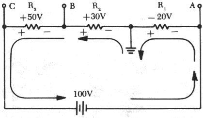 When the current reaches tap B, 30 more volts have been used to move the electrons through R2, and in a similar manner the remaining 50 volts are used for R3. But the voltages across R2 and R3 are positive voltages, since they are above ground potential. Figure 8-76 shows the voltage divider used previously. The voltage drops across the resistances are the same; however, the reference point (ground) has been changed. The voltage between ground and tap A is now a negative 100 volts, or the applied voltage. The voltage between ground and tap B is a negative 80 volts, and the voltage between ground and tap C is a negative 50 volts. |