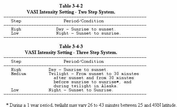 VASI systems with remote on-off switching shall be operated when they serve the runway in use and where intensities are controlled in accordance with Table 3-4-1 and Table 3-4-2 except:
