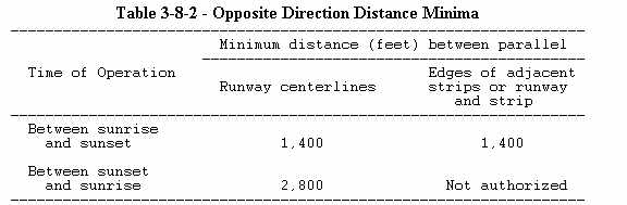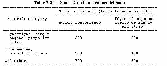 c. The distance between the runways or landing strips is in accordance with the minima in Table 3-8-1 (use the greater minimum if two categories are involved).