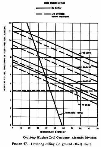 Figure 57 illustrates the hovering ceiling in ground effect for temperature and gross weight variations for one helicopter, but does not reflect the effect that moisture content has on the performance. For example, at a gross weight of 1,550 pounds and a temperature of 100° F., the hovering ceiling is a pressure altitude of 4,100 feet.