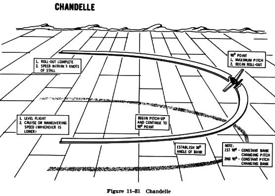 A "chandelle" is a climbing turn beginning from approximately straight and level flight, and ending at the completion of 180 degrees of turn in a wings level, nose high attitude at the minimum controllable airspeed (Fig. 11-31). The maneuver demands that the maximum flight performance of the airplane be obtained; that is, the airplane should gain the most altitude possible for a given degree of bank and power setting without stalling. However, since numerous atmospheric variables beyond control of the pilot will affect the specific amount of altitude gained, the altitude gain is not a criterion of the quality of the maneuver.