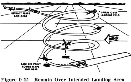 Utilizing any combination of normal gliding maneuvers, from wings level to spirals, the pilot should eventually arrive at the normal "key" position at a normal traffic pattern altitude for the selected landing area. From this point on, the approach will be as nearly as possible a normal power off approach (Fig. 9-21). |