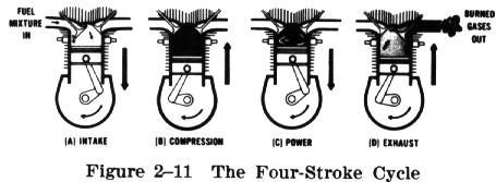 | The series of operations or events through which each cylinder of a reciprocating engine must pass in order to operate continuously and deliver power is called an engine cycle. The events that occur are intake, compression, power, and exhaust (Fig. 2-11). This cycle requires four strokes of the piston, two up and two down. Ignition of the fuel/air mixture at the end of the compression stroke adds a fifth event; consequently, the cycle of events is known as the four stroke, five event cycle principle. | ![]() |
