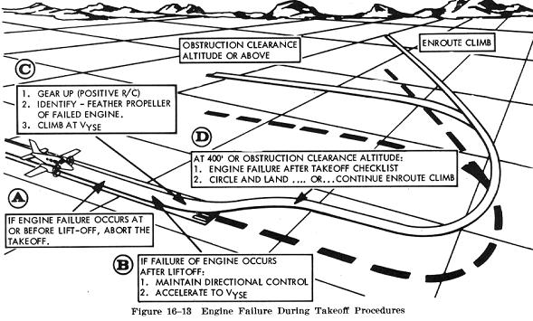 In all cases, the airplane manufacturer's recommended procedure for single engine operation should be followed. The general procedure listed below is not intended to replace or conflict with any procedure established by the manufacturer of any airplane. It can be used effectively for general training purposes and to emphasize the importance of Vyse. It should be noted that this procedure is concerned with an engine failure on a takeoff where obstacle clearance is not critical. If the decision is made to continue flight after an engine failure during the takeoff climb, the pilot should maintain directional control at all times and: