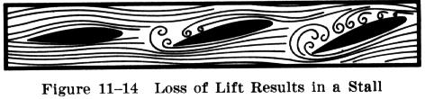 A stall occurs when the smooth airflow over the airplane's wing is disrupted, and the lift degenerates rapidly (Fig. 11-14). This can occur AT ANY AIRSPEED, IN ANY ATTITUDE, WITH ANY POWER SETTING.