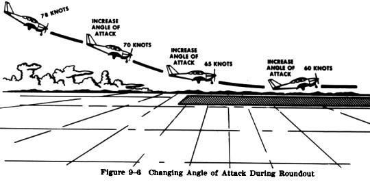 When the angle of attack is increased, the lift is momentarily increased, thereby decreasing the rate of descent (Fig. 9-6). Since power normally is reduced to idle during the roundout, the airspeed will also gradually decrease. This, in turn, causes lift to decrease again; it must be controlled by raising the nose and further increasing the angle of attack. During the roundout, then, the airspeed is being decreased to touchdown speed while the lift is being controlled so the airplane will settle gently onto the landing surface. The roundout should be executed at a rate that the proper landing attitude and the proper touchdown airspeed are attained simultaneously just as the wheels contact the landing surface.