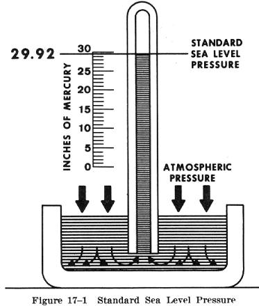 Because air has mass and weight, it is a body, and as a body, it reacts to the scientific laws of bodies in the same manner as other gaseous bodies. This body of air resting upon the surface of the earth has weight (Fig. 17-1) and at sea level develops an average pressure of 14.7 pounds on each square inch of surface, or 29.92 inches of mercury, - but as its thickness is limited, the higher we go the less air there is above us. For this reason, the weight of the atmosphere at 18,000 feet is only one-half what it is at sea level. |
