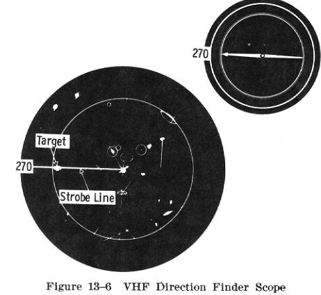 The VHF/DF operator on the ground can note the airplane's bearing from the facility by looking at a scope, quite similar to a radar scope. Each time the pilot transmits, it shows up on the scope as a line radiating out from the center (Fig. 13-6). From this the operator reads the course the pilot should fly (with zero wind conditions) to reach the facility. The pilot need not be concerned about wind drift since subsequent heading instructions will consider the position to which the airplane has drifted and a new course plotted. |