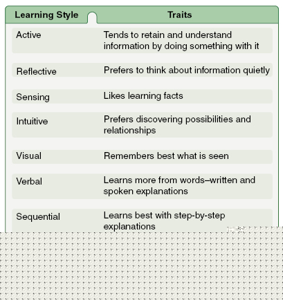 Holistic/Serialist Theory As seen in Figure 2-14, right and left brain learners have preferences for how they process information. Based on information processing theory, left brain learners or serialist learners have an analytic approach to learning. Because they gain understanding in linear steps, with each step logically following the previous one, these learners need well-defined, sequential steps where the overall picture is developed slowly, thoroughly, and logically. This is a bottom-up strategy. Right brain or holistic learners favor the holist strategy and prefer a big picture or global perspective. This is a top-down strategy and learners tend to learn in large jumps, absorbing material almost randomly without seeing connections, until suddenly “it” clicks and they get it. Global learners solve complex problems rapidly once they have grasped the big picture, but they often have difficulty explaining how they did it. This type of learner seeks overall comprehension; analogies help this learner. Index of Learning Styles (ILS) In 1988, Richard Felder and Linda Silverman designed a learning style model with parallel learning styles that classified students as having learning preferences in sensing or intuitive, visual or verbal, active or reflective, sequential or global (discussed under holistic/serialist learning style. Dr. Felder maintains a website at www4.ncsu.edu/unity/lockers/users/f/felder/public/RMF.html that offers learners the opportunity to assess learning preferences at no cost for noncommercial purposes. [Figure 2-15]