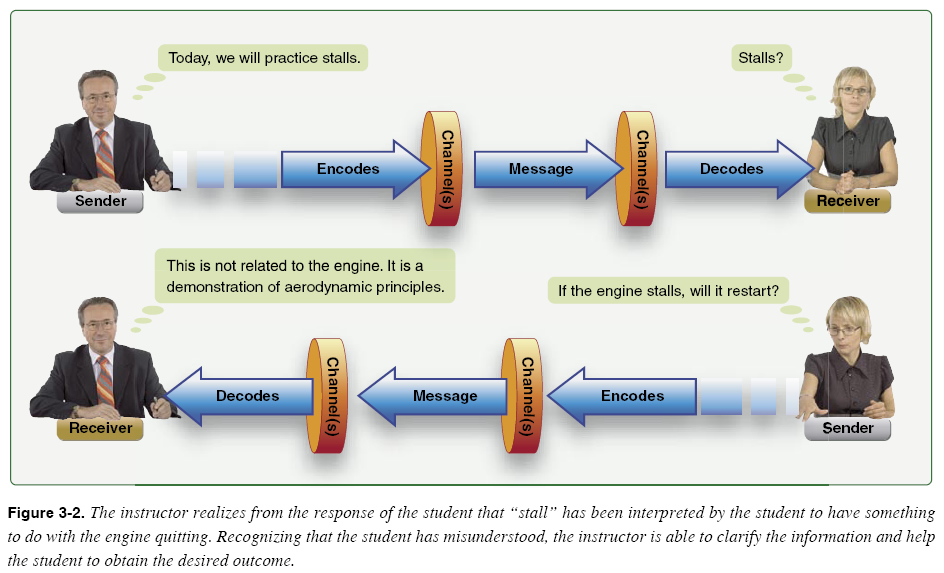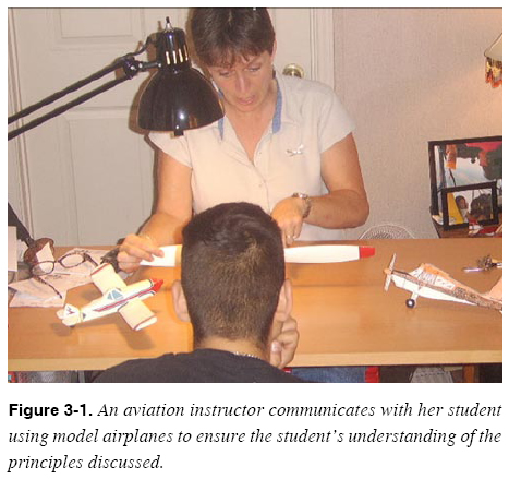 The three elements are dynamically interrelated since each element is dependent on the others for effective communication to take place. The relationship between the source and the receiver is also dynamic and depends on the two-way flow of symbols between the source and the receiver. The source depends on feedback from the receiver to properly tailor the communication to the situation. The source also provides feedback to the receiver to reinforce the desired receiver responses. Source As indicated, the source in communication is the sender, speaker, writer, encoder, transmitter, or instructor. The effectiveness of persons acting in the role of communicators is related to at least three basic factors. First, their ability to select and use language is essential for transmitting symbols that are meaningful to listeners and readers. It is the responsibility of the speaker or writer, as the source of communication, to realize that the effectiveness of the communication is dependent on the receiver’s understanding of the symbols or words being used. For example, if an aviation maintenance instructor were to use aviation acronyms like ADs, TCDS or STCs or a flight instructor were to use aviation acronyms like ILS, TCAS, or TAWS with a new maintenance student or student pilot respectively, effective communication would be difficult if not impossible. Use of aviation acronyms or technical language is necessary, but the student must be taught the language first. Conversely, a speaker or writer may rely on highly technical or professional background with its associated vocabulary while addressing a receiver with a similar background. Second, communicators consciously or unconsciously reveal attitudes toward themselves as a communicator, toward the ideas being communicated, and toward the receivers. These attitudes must be positive while delivering the message if they are to communicate effectively. Communicators must be confident; they should illustrate that the message is important and that the receiver has a need to know the ideas presented. Third, communicators are more likely to be successful when they speak or write from accurate, up-to-date, and stimulating material. Communicators must constantly strive to have the most current and interesting information possible. In this way, the receiver’s interest can be held. Out-of-date information causes the instructor to lose credibility in the eyes of the receiver. Use of monotonous or uninteresting information runs the risk of losing the receiver’s attention. Symbols At its basic level, communication is achieved through symbols, which are simple oral and visual codes. The words in the vocabulary constitute a basic code. Common gestures and facial expressions form another, but words and gestures alone do not communicate ideas. Ideas are communicated only when symbols are combined in meaningful wholes, as in ideas, sentences, paragraphs, speeches, or chapters that mean something to the receiver. When symbols are combined into these units, each portion becomes important to effective communication. On a higher level, communication through symbols is achieved by their interpretation through different perceptions, sometimes referred to as channels. While many theories have been proposed, one popular theory indicates that the symbols are perceived through one of three sensory channels: either visual, auditory, or kinethestic. As discussed in Chapter 2, visual learners rely on seeing, auditory prefers listening and speaking, while kinesthetic learners process and store information through physical experience such as touching, manipulating, using, or doing. The instructor will be more successful in gaining and retaining the student’s attention by using a variety of channels. As an example, instead of telling a student to adjust the trim, the instructor can move the trim wheel while the student tries to maintain a given aircraft attitude. The student experiences by feel that the trim wheel affects the amount of control stick pressure needed to maintain the attitude. At the same time, the instructor can explain to the student that what is felt is forward or back pressure on the control stick. After that, the student begins to understand the correct meaning of control pressure and trim, and when told to adjust the trim to relieve control pressure, the student responds in the manner desired by the instructor. Most frequently, communicators select the channels of hearing and seeing. For motor skills, the sense of touch, or kinesthetic learning, is added as the student practices the skill. The feedback an instructor is getting from a student needs to be constantly monitored in order to modify the symbols, as required, to optimize communication. [Figure 3-2] In addition to feedback received by the instructor from the students, students need feedback from the instructor on how they are doing. The feedback not only informs the students of their performance, but can also serve as a valuable source of motivation. An instructor’s praise builds the student’s self-confidence and reinforces favorable behavior. On the other hand, negative feedback must be used carefully. To avoid embarrassing a student, use negative feedback only in private. This information should be delivered as a description of actual performance and given in a nonjudgmental manner. For example, it would be appropriate to tell a maintenance student that a safety wire installation is not satisfactory. To refer to the work as careless would not be good and could do harm to the student’s feeling of self-worth.