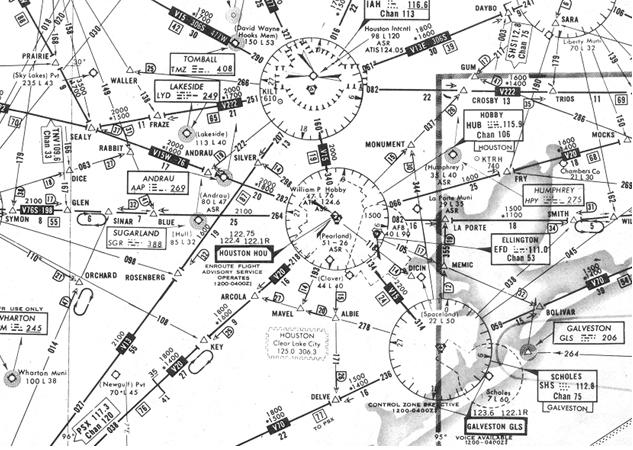 Like highways, Victor airways are designated by number - generally north/south airways are odd; east/west airways are even. When airways coincide on the same radial, the airway segment shows the numbers of all the airways on it. For example, the Humble 290 radial in the chart excerpt (Fig. 10-3), defines three airways V15-306S-477W.