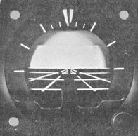 One improved attitude indicator design is shown in Figure 4-27. In this design, the "SLOTTED" bank index has been moved to the upper periphery of the case to improve readability of the angle of bank as read on the graduated scale which is attached to the case. Further bank references are to be seen in the form of converging lines to a point on the horizon. Pitch references are the horizon line and the ground lines parallel to the horizon line.