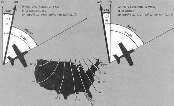 In flight, allowance must be made for the difference in locations of the geographic and magnetic poles if your course reference is the geographic (true) pole, because the aircraft compass is oriented to the magnetic pole. Lines of equal magnetic declination or "variation" are called isogonic lines, and are plotted in degrees of east and west variation on aeronautical charts. A line connecting points of zero degrees variation is called the agonic line. These lines are replotted periodically on aeronautical charts to correct any change which may have occurred as a result of the shifting of the poles, or any changes caused by local magnetic disturbances. Figure 4-32 shows the irregular pattern of the lines of equal variation in the United States.