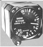 The radar altimeter, also known as radio altimeter, provides a continuous indication of aircraft height above the ground. The system is a "downlooking" device which accurately measures the distance between the aircraft and the highest object on the terrain. The time interval between a transmitted and received radio signal is automatically converted into an absolute altitude reading. The radar altimeter shown in Figure 4-11 has a dial type readout. Another type has a digital presentation. A warning light and aural tone are also provided in this model, which alerts the pilot when the aircraft reaches a preselected altitude.