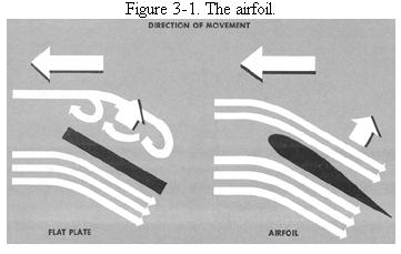 If a flat plate is moved through the air (Fig. 3-1), the airstream which strikes the plate is forced downward on impact against the plate. The reaction to this downward force produces a resultant force upward (lift) and a backward force (drag). A rock or a barn door will fly, given an airstream sufficient to produce lift. More efficient is the airfoil, a surface constructed to produce the maximum lift with the minimum drag. Airfoil shapes vary according to the aircraft performance to which the airfoil is designed. The most efficient shape, for the type of aircraft used for civilian instrument training, has a rounded leading edge, smooth cambered surfaces, and a sharp trailing edge.