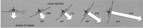 A load factor is the ratio of a specified load to the total weight of the airplane. The specified load may be expected in terms of aerodynamic forces, as in turns. In level flight in undisturbed air, the load factor is 1; the wings are supporting only the weight of the airplane. In a coordinated level turn, the wings are supporting not only the weight of the aircraft, but centrifugal force as well. As the bank steepens, the horizontal lift component increases, centrifugal force increases, and the load factor increases (Fig. 3-10). In a coordinated level turn with a 60° bank, the wings support a load equal to twice the weight of the aircraft. To provide the lift to balance this load, the angle of attack must be increased. However, if the load factor becomes so great that an increase in angle of attack cannot provide enough lift to support the load, the wing stalls. Since the stalling speed increases directly with the square root of the load factor, you should be aware of the flight conditions during which the load factor can become critical. Steep turns at low airspeed, structural ice accumulation, and vertical gusts in turbulent air can increase the load factor to a critical level.