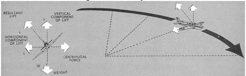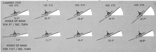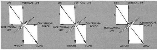 As airspeed is increased in a constant-rate level turn, both the radius of turn and centrifugal force increase. This increase in centrifugal force must be balanced by an increase in the horizontal lift component, which can be accomplished only by increasing the angle of bank. Thus, to maintain a turn at a constant rate, the angle of bank must be varied with changes in airspeed (Fig. 3-9).