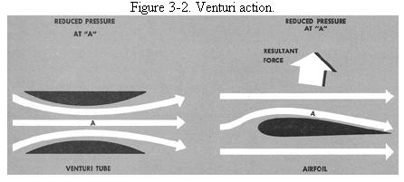 As the wing moves through the air, the airstream is divided, part of it flowing over one surface while the remainder flows under the other surface (Fig. 3-2). The air flowing over the upper cambered surface, as shown in the diagram, has a longer path to travel and has to flow faster than the air over the opposite surface to reach the trailing edge at the same time. Application of Bernoulli's principle to both Venturi tube and airfoil shows that the air flowing faster exerts the lesser pressure. Because of the resulting differential pressure, the wing is supported by the higher pressure below the lower surface.