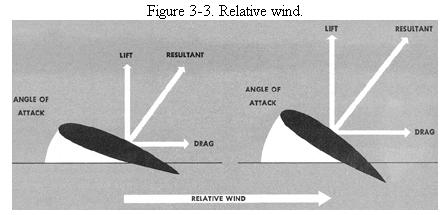 The relative wind (Fig. 3-3) is the motion of the air relative to the chord line of the airfoil. The air can be moving past the airfoil or the airfoil can be moving through the air. The relative wind, as applied to airplanes, is parallel and opposite to the flight path of the aircraft.