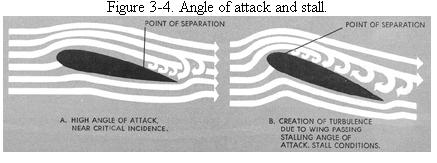 A stall is the result of any condition that disrupts the smooth flow of air over the airfoil to the point where sufficient lift is no longer produced by the differential pressure. The wing can stall in any attitude and at any speed. As the angle of attack of the wing is increased, the air particles are forced to make sharper and sharper changes in direction to follow the contour of the wing. With increasing angles of attack, disruption of smooth airflow occurs initially at the trailing edge and moves forward toward the leading edge at higher angles of attack. The wing stalls when the progressive increase in turbulence on the top cambered surface results in a net loss of lift (Fig. 3-4).