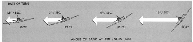 The rate of turn at any given airspeed depends on the amount of sideward force causing the turn; that is, the horizontal lift component. The horizontal lift component varies directly in proportion to bank in a correctly executed turn. Thus, the rate of turn at a given airspeed increases as the angle of bank increases (Fig. 3-8). As the illustration shows, at 130 knots and approximately 10° of bank, an aircraft completes a 360° turn in 4 minutes. At the same airspeed and approximately 55° of bank, the rate of turn is eight times as great.