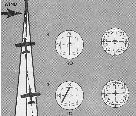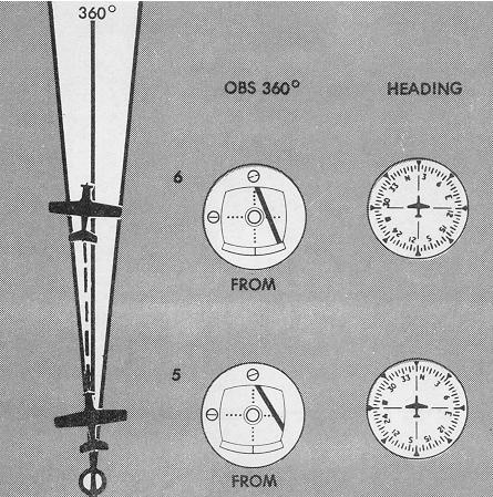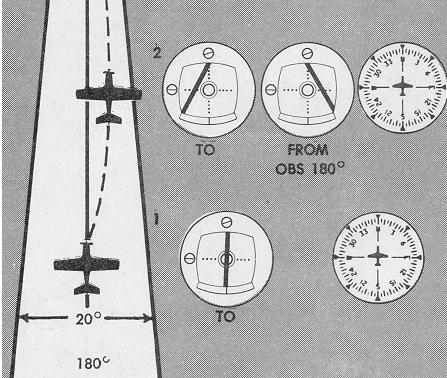 5 and 6. Following station passage and TO/FROM reversal, correction to course centerline is still toward the needle. Note that the extent of CDI deflection is, by itself, no indication of the amount of aircraft displacement from the course centerline. A large CDI deflection immediately following station passage calls for no heading correction until the CDI stabilizes; at 20 miles out, a two-dot deflection may require a large correction angle for return to centerline.