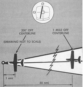 Aircraft displacement from course is approximately 200 ft. per dot per nautical mile. For example, at 30 nautical miles from the station, one dot deflection indicates approximately one nmi displacement of the aircraft from the course centerline.