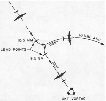 2. Since a 0.5 nautical mile lead is satisfactory for groundspeeds of 150 knots or less, start the turn to the arc at 10.5 miles. At higher groundspeeds, use a proportionately greater lead.