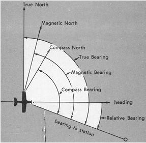 A bearing is simply the direction of a straight line between the aircraft and station, or vice-versa. The bearing line measured clockwise from the nose of the aircraft is a relative bearing; measured clockwise from true north, it is a true bearing; measured clockwise from magnetic north, it is a magnetic bearing (Fig. 8-22 and Fig. 8-23). As the illustrations show, a true, magnetic, or compass heading is measured clockwise from the appropriate north, and a relative bearing is measured clockwise from the nose of the aircraft. Thus, the true, magnetic, or compass bearing to the station is the sum of true, magnetic, or compass heading, respectively, and the relative bearing.