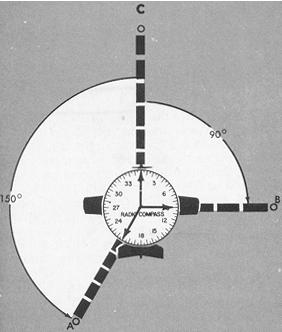 You will probably orient yourself more readily if you think in terms of nose/tail and left/right needle indications, visualizing the ADF dial in terms of the longitudinal axis of the aircraft. When the needle points to 0°, the nose of the aircraft points directly to the station; with the pointer on 210°, the station is 30° to the left of the tail; with the pointer on 090°, the station if off the right wing tip (Fig. 8-24). Thus, to turn directly toward station A, turn left 150° since the needle points to the left of the nose/tail line 30° from the tail position. Station B is 90° to the right; therefore turn right 90° to head directly toward the station.
