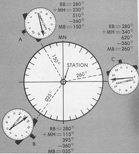 Figure 8-25 shows only one of several methods of determining bearings - or lines of position - between aircraft and station. Visualizing the 80° left-of-nose indication at all three positions shown, the magnetic bearing to station can be determined by subtracting the left deflection from the magnetic heading: