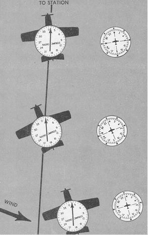 Homing. ADF homing is flying the aircraft on any heading required to keep the azimuth needle on 0° until the selected station has been reached (Fig. 8-26). To head the aircraft toward the station, turn to the heading that will zero the ADF needle. The heading indicator, rather than the ADF, should be used to make the turn. At the completion of the initial turn toward the station, check with the ADF needle and, if necessary, zero it with small corrections.
