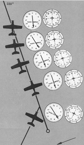 When you are close to the station, slight deviations from the desired track result in large deflections of the azimuth needle. It is important, therefore, that the correct drift correction angle be established as soon as possible after interception of an inbound course. With the course "pinned down" and heading corrections kept at a minimum, you will be more alert to signs of station approach than you would be if you were busy "chasing" headings and ADF deflections. Make small heading corrections (not over 5°) as soon as the needle shows a deviation from course, until it begins to rotate steadily toward a wing-tip position or shows erratic left/right oscillations. At this point, hold your last corrected heading constant, and time station passage when the needle shows either wing-tip position or settles at or near the 180° position. The time interval from the first indications of station proximity to positive station passage varies with altitude - a few seconds at low levels to 3 minutes at high altitude.