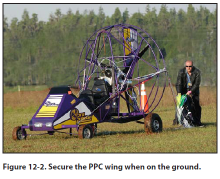 The best safety procedure is prevention. To safeguard a PPC from high winds, immediately after landing, secure the wing. Even if you only intend to refuel, it is highly recommended to condense the exposure of the wing to the elements: the harmful ultraviolet rays of the sun and those unexpected wind gusts. As soon as possible after landing, condense the wing by folding it on top of itself and put something on top of it to secure it. It is best to pack the canopy to keep it out of the sun and make sure the wind cannot inflate the wing and if possible, lean the nose wheel up, then place the fan guard of the cart back and down on the folded wing. Securing it this way will usually be adequate for short breaks when the make and model allows for this static positioning. [Figure 12-2]