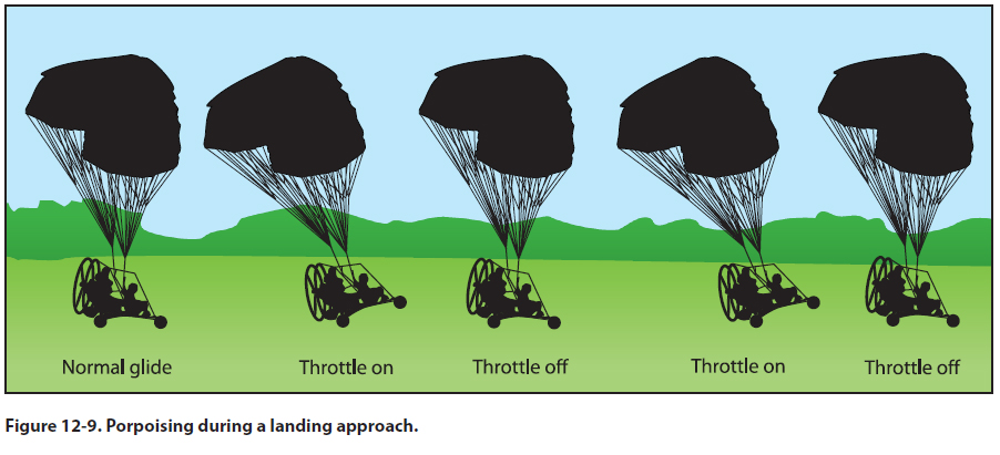 Porpoising refers to pitch oscillations, most noticeable during a landing. These erratic pilot-induced movements are a result of rapid throttle movements. This is a common, correctable error pilots need to be aware of. There is a delay between throttle changes and pitch changes. Porpoising will result if you overcontrol the throttle during a landing attempt, causing pitch oscillations. As a result of over-reacting, the PPC, which is now dangerously close to the ground, will be further induced into increasing the forward/ rearward swinging oscillations from the pilot throttle movements. [Figure 12-9]