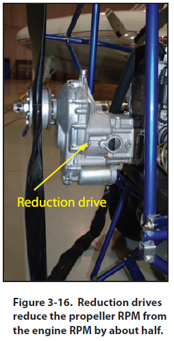 The typical powered parachute engine can be two- or four-stroke, liquid- or air-cooled, 50 to 100 horsepower. Some engines have electric starters and some have pull starters. Most PPC engines have reduction drives that, when attached, reduce the propeller RPM to half to one quarter the engine RPM. [Figure 3-16] The engines are as varied as the powered parachutes they power. Modern technology has allowed the powered parachute engine to become lighter, more efficient and, most importantly, dependable. Chapter 4 covers the powerplant in more detail.