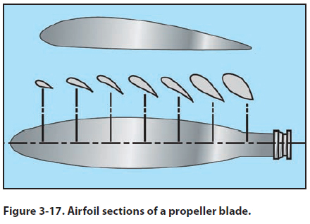 Propellers are “power converters” that change the engine horsepower into “thrust.” Thrust is the force that propels the aircraft through the air by pushing the powered parachute forward. Aerodynamically speaking, a propeller is a rotating airfoil and the same principles that apply to the wing will apply to the propeller. [Figure 3-17] Engine power is transferred to the propeller through a rotating crankshaft that turns the propeller through the air, producing thrust in the same way as wings produce lift. The shape of the blade creates thrust vectors because it is cambered like the airfoil of a wing. Consequently, as the air flows past the propeller, the pressure on one side is less than that on the other. As in a wing, this produces a reaction force in the direction of the lower pressure. In the case of the propeller, which is mounted in a vertical plane, the area of decreased pressure is in front of the propeller, and the force (thrust) is in a forward direction. Aerodynamically, the thrust is the result of the propeller shape and the angle of attack of the blade.
