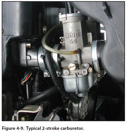 Carburetors are normally set at sea-level pressure, with the jets and settings determined by the manufacturer. [Figure 4-9] However, as altitude increases, the density of air entering the carburetor decreases, while the density of the fuel remains the same. This creates a progressively richer mixture, same fuel but less air, which can result in engine roughness and an appreciable loss of power. The roughness is usually due to spark plug fouling from excessive carbon buildup on the plugs. Carbon buildup occurs because the excessively rich mixture lowers the temperature inside the cylinder, inhibiting complete combustion of the fuel. This condition may occur at high-elevation airports and during climbs or cruise flight at high altitudes. To maintain the correct fuel-air mixture, you can change the main jets and the midrange jets setting for base operations at a high density altitude airport. Operating from low altitude airports and climbing to altitude where the mixture becomes rich for short periods is OK.