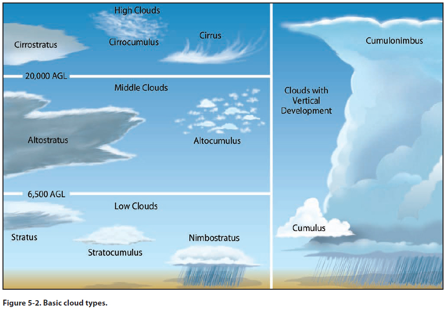 Understand the different cloud formations and the ground/air effects they can produce. [Figure 5-2] Cloud clearance and visibility should be maintained for the operations you intend to conduct (see Chapter 8 for cloud clearance requirements in each class of airspace). Knowledge of thermals and turbulence, and how to determine where they can occur is also important. [Figure 5-3]