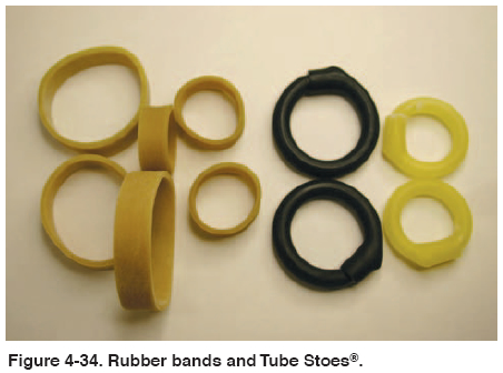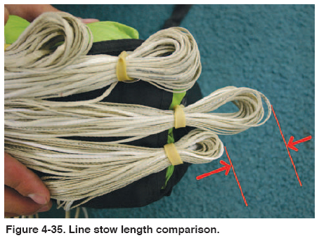The rubber stow bands play an important part of the deployment sequence, and serve two important functions. First, they hold the mouth of the deployment bag closed and prevent premature deployment of the main canopy. Secondly, they hold the line stows securely to allow a clean, orderly deployment of the lines. With the advent of smaller diameter lines, such as 550 Spectra® and HMA®, smaller diameter rubber bands have been developed to properly secure these lines. If the smaller rubber bands are not available, many parachutists double stow the larger rubber bands around the small lines. There are other products such as Tube Stoes®, which are designed to replace rubber bands and last longer. Figure 4-34 shows the various rubber bands and Tube Stoes®. In addition to the correct rubber bands, the length of the line stows is important as well. In the past, 1" stows were common, but today, 3" stows are recommended by several manufacturers. Figure 4-35 shows the comparison between the two lengths. The main point to remember is that the lines must be stowed neatly and securely.