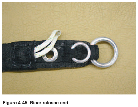 • Main riser rings. Check for webbing wear, hardware plating, grommet wear, and locking loop wear/damage. [Figure 4-45]