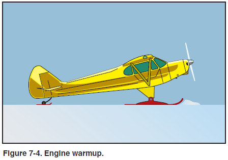 STARTING Adequately preheat the engine, battery, and the cockpit instruments before startup and departure. Sometimes engine oil may require heating separately. Check the manufacturer’s recommendation for starting the engine when ambient temperatures are below freezing. Batteries require special consideration. In cold climates a strong, fully charged battery is needed. With just a little cold-soaking, the engine may require three times the usual amperage to crank the engine. Another consideration is the electrolyte freezing point. A fully charged battery can withstand temperatures of -60 to -90° F since the electrolyte’s specific gravity is at a proper level. Conversely, the electrolyte in a weak or discharged battery may freeze at temperatures near 32° F. If a fully charged battery is depleted by an unsuccessful start, it may freeze as it cools to ambient temperature. Later, when the engine is started and the battery is receiving a charge, it could explode. After start, a proper warmup should be completed prior to a runup and high power settings. Perform the warmup according to the engine manufacturer’s recommendations. Some manufacturers recommend a minimum of 1,000 r.p.m. to ensure adequate lubrication. If the skiplane is parked on heavily crusted snow or glaze ice with the skis frozen to the surface, it may be possible to start the engine and perform the runup in the parking area. Be sure the area behind the skiplane is clear, so as not to cause damage with the propeller wash. If a ski should become unstuck during the runup, reduce power immediately. Then use one of the following procedures to secure the airplane. Tie down or chock the skiplane prior to engine start, warmup, and runup. Keep all ropes, bags, etc., clear of the propeller. After warmup is complete, and if no assistance is available, shut down the engine to untie and unchock the skiplane, then restart as quickly as possible. If a post, tree, boulder, or other suitable object is available, tie a rope to an accessible structural component in the cockpit, take the end around the anchor object, bring it back to the cockpit, and tie it off with a quick-release knot. When the warmup and runup are complete, release the knot and pull the rope into the cockpit as the skiplane begins to taxi. If tiedowns or chocks are not available, build small mounds of snow in front of each ski. The mounds must be large enough to prevent the skiplane from taxiing over them during engine start and warmup, but small enough to allow taxiing when power is applied after the warmup is complete. If tiedowns or means to block the skis are not available, the runup can be accomplished while taxiing when clear of obstacles or other hazards. [Figure 7-4]