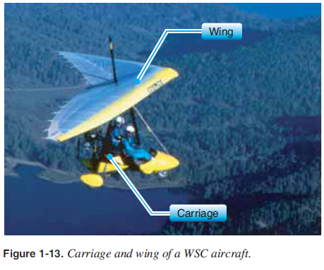 CHAPTER 1. Introduction To Weight-Shift Control Weight-Shift Control Aircraft WSC aircraft are single- and two-place trikes that do not meet the criteria of an ultralight vehicle but do meet the criteria of LSA. The defi nition for WSC can be found in 14 CFR part 1. Flight control of the aircraft depends on the wing’s ability to fl exibly deform rather than on the use of control surfaces. The common acronyms for this LSA are WSC (weight-shift control); WSCL (WSC land), which can be wheels or ski equipped; and WSCS (WSC Sea) for water operations. A LSA WSC used for sport and private pilot fl ying must be registered with a FAA N-number, have an airworthiness certificate, a pilot’s operating handbook (POH), and/or limitations with a weight and loading document aboard. The aircraft must be maintained properly by the aircraft owner or other qualifi ed personnel and have the aircraft logbooks available for inspection. Dual fl ight controls are required in two-seat aircraft used for training. The carriage is comprised of the engine and fl ight deck attached by a structure to wheels, fl oats, or skis; it may also be referred to as the fuselage. The wing is the sail, structure that supports the sail, battens (ribs) that form the airfoil, and associated hardware. [Figure 1-13] ![]() There are several unique features of the WSC aircraft: