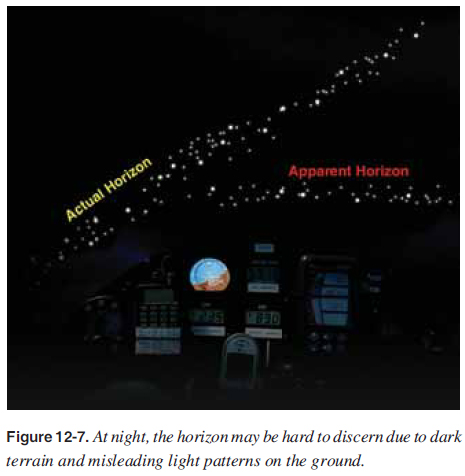 On a clear night, distant stationary lights can be mistaken for stars or other aircraft. Even the northern lights can confuse a pilot and indicate a false horizon. Certain geometrical patterns of ground lights, such as a freeway, runway, approach, or even lights on a moving train can cause confusion. Dark nights tend to eliminate reference to a visual horizon. As a result, pilots need to rely less on outside references at night and more on fl ight and navigation instruments. Visual autokinesis can occur when a pilot stares at a single light source for several seconds on a dark night. The result is that the light appears to be moving. The autokinesis effect does not occur if the pilot expands the visual fi eld. It is a good procedure to vary visual focus and not become fi xed on one source of light. Distractions and problems can result from a flickering light in the fl ight deck, such as anticollision lights, strobe lights, or other aircraft lights which can cause flicker vertigo. If continuous, the possible physical reactions can be nausea, dizziness, grogginess, confusion, headaches, or unconsciousness. The pilot should try to eliminate any light source causing blinking or fl ickering problems in the fl ight deck. A black-hole approach occurs when the landing is made from over water or unlighted terrain on which runway lights are the only sources of light. Without peripheral visual cues to help, pilots have trouble orienting themselves relative to Earth. The runway can seem out of position (downsloping or upsloping) and, in the worst case, result in landing short of the runway. If an electronic glideslope or visual approach slope indicator (VASI) is available, it should be used. If navigation aids (NAVAIDs) are unavailable, careful attention should be given to using the fl ight instruments to assist in maintaining orientation and a normal approach. If at any time the pilot is unsure of his or her position or attitude, a go-around should be executed. Bright runway and approach lighting systems, especially where few lights illuminate the surrounding terrain, may create the illusion of less distance to the runway. In this situation, the tendency is to fl y a higher approach. Also, when fl ying over terrain with only a few lights, it makes the runway recede or appear farther away. With this situation, the tendency is common to fl y a lower-than-normal approach. If the runway has a city in the distance on higher terrain, the tendency is to fl y a lower-than-normal approach. A good review of the airfi eld layout and boundaries before initiating any approach helps the pilot maintain a safe approach angle. Illusions created by runway lights result in a variety of problems. Bright lights or bold colors advance the runway, making it appear closer. Night landings are further complicated by the diffi culty of judging distance and the possibility of confusing approach and runway lights. For example, when a double row of approach lights joins the boundary lights of the runway, there can be confusion where the approach lights terminate and runway lights begin. Under certain conditions, approach lights can make the aircraft seem higher in a turn to fi nal than when its wings are level. |