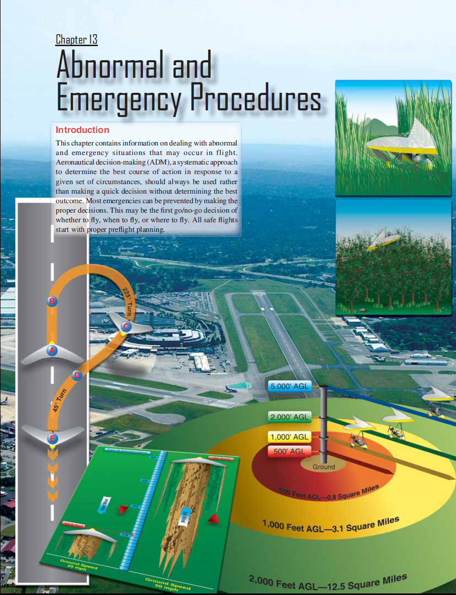 Throughout this chapter, all abnormal and emergency decisions should be based on ADM. Some situations allow more time than others to evaluate the outcome. ADM should be applied to any unplanned or unexpected situation presented. In addition to ADM, the key to any emergency situation, and/or preventing a abnormal situation from progressing to a true emergency is a thorough familiarity with, and adherence to, the procedures developed by the manufacturer and contained in the Aircraft Flight Manual and/or Pilot’s Operating Handbook (AFM/POH). The following guidelines are generic and not meant to replace the manufacturer’s recommended procedures. Rather, they are meant to enhance the pilot’s general knowledge in the area of abnormal and emergency operations. If any of the guidance in this chapter confl icts with the manufacturer’s recommended procedures for a particular make and model weight-shift control (WSC) aircraft, the manufacturer’s recommended procedures take precedence. |
