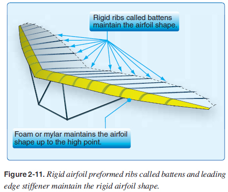 CHAPTER 2. Aerodynamics WSC Wing Flexibility The WSC wing retains its rigid airfoil shape due to rigid preformed ribs called battens, which are inserted from the root to the tip along the span of the wing (similar to ribs for an airplane wing) and a piece of foam or mylar running along the top side of the leading edge to the high point, which maintains its front part of the airfoil shape in between the battens. [Figure 2-11] ![]() Some WSC double surface wing designs use a rib similar to a PPC wing that attaches to the lower surface and the upper surface to maintain the wing camber in addition to the battens. Even though the airfoil sections are rigid, the WSC aircraft is called a “ fl ex wing” for two reasons. First, it is designed so the outboard leading edges fl ex up and back when loaded. The fl exing of the outboard section of the wing also allows load relief because the tips increase twist and decrease AOA—the greater the weight, the greater the fl ex and wing twist. This fl exing allows the WSC aircraft to automatically reduce loads in unstable air, providing a smoother ride than a rigid wing. Since the wing fl exes and reduces the load for a given angle of attack at the root chord, WSC aircraft cannot obtain loads as high as those obtained by a rigid wing. This fl exing of the outboard leading edges also assists in initiating a turn. Second, the wing is designed to fl ex as it changes twist from side to side for turning, historically known as wing warping. WSC wing warping is similar to what the Wright Brothers did on their early aircraft, but they did it with wires warping the wing. The WSC aircraft uses no wires and warps the wing by shifting the weight, which is covered in Chapter 3, Components and Systems. This fl exibility is designed into the wing primarily for turning the aircraft without any movable control surfaces like the ailerons and rudder on an airplane. |