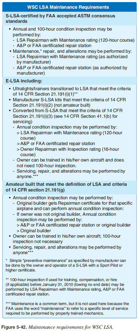 ARROW is the acronym commonly used to remember these items. The PIC is responsible for making sure the proper documentation is on board the aircraft when operated. [Figure 5-41] ![]() Aircraft logbooks are not required to be on board when it is operated. However, inspect the aircraft logbooks prior to fl ight to confi rm the WSC aircraft has had all required inspections. The owner/operator must keep maintenance records for the airframe and powerplant. At a minimum, there must be an annual condition inspection within the preceding 12 calendar months. In addition, the WSC aircraft may also need a 100-hour inspection in accordance with 14 CFR part 91 if it is used for hire (e.g., for training operations). [Figure 5-42] If a transponder system is used, the transponder must be inspected within each preceding 24 calendar months. ![]() The pilot must have in his or her possession a Sport pilot certifi cate for the aircraft being fl own, medical eligibility, and a government issued photo identifi cation. For a Sport Pilot Certifi cate, medical eligibility can be a valid United States driver’s license, which also serves as government issued photo identifi cation. To fl y the aircraft with Private Pilot privileges, the pilot needs a valid FAA minimum third class medical certifi cate accompanied by a government issued photo identifi cation and Private Pilot certifi cate for WSC aircraft. See Chapter 1, Introduction to Weight-Shift Control, for details on specifi c pilot certifi cates and privileges. |