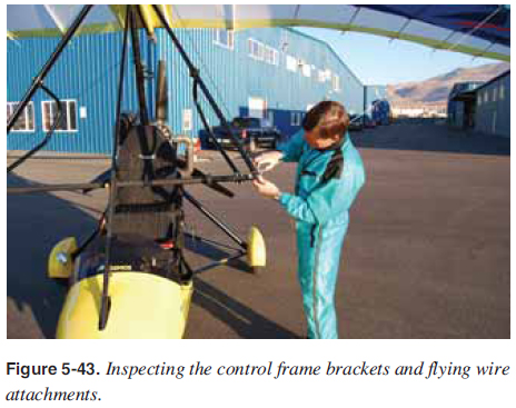 Inspect the control frame, down tubes and control bar for dents and ensure they are straight. Inspect the control frame attachment to the keel. Inspect the control bar to down tube brackets and bolts. [Figure 5-43] Inspect fore and aft fl ying wire condition, attachment to the keel, and the lower control bar corner brackets.